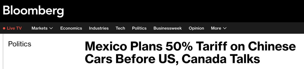 និយាយអំពីបញ្ហាពន្ធនេះ ម៉ិកស៊ិកគ្រោងនឹងដំឡើងពន្ធលើរថយន្តពីអាស៊ី ជាពិសេសផ្តោតលើប្រទេសចិនរហូតដល់ 50% ដែលបង្កឱ្យមានភាពតានតឹងខ្លះសម្រាប់កិច្ចព្រមព្រៀងពាណិជ្ជកម្ម ខណៈដែលម៉ិកស៊ិកបានក្លាយជាទិសដៅធំបំផុតសម្រាប់រថយន្តពីប្រទេសចិន។ ចំពោះប្រទេសផ្សេងទៀតដូចជាសហរដ្ឋអាមេរិក និងកាណាដា ពួកគេទំនងជាមិនរងផលប៉ះពាល់ដោយសារកតិកាសញ្ញាពាណិជ្ជកម្មសេរី ដែលត្រូវបានគេស្គាល់ថា USMCA។