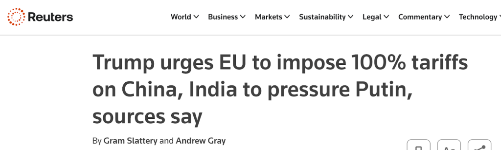 ទន្ទឹមនឹងនេះដែរ លោកប្រធានាធិបតី Donald Trump បានជំរុញឱ្យ EU ដាក់ពន្ធ 100% លើឥណ្ឌា និងចិនសម្រាប់ការទិញប្រេងពីរុស្ស៊ី ទោះបីជាមនុស្សជាច្រើននៅតែជឿថាតំបន់អឺរ៉ុបអាចនឹងបដិសេធនឹងសំណើរនេះក៏ដោយ។