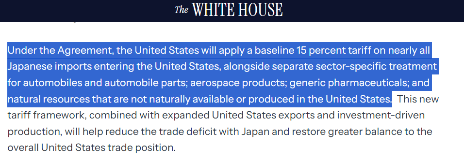 Per the White House, President Donald Trump signed an executive order Thursday to enact a U.S.-Japan trade deal, imposing a 15% tariff on most Japanese imports, with specific provisions for automobiles, aerospace, generic pharmaceuticals, and scarce natural resources. The reduced tariffs on Japanese cars will take effect seven days after the order.