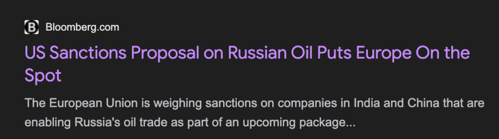 សហភាពអឺរ៉ុបត្រូវបានគេរាយការណ៍ថាកំពុងពិចារណាដាក់ទណ្ឌកម្មលើក្រុមហ៊ុននៅក្នុងប្រទេសឥណ្ឌា និងចិនដែលកំពុងជួយរុស្ស៊ីក្នុងពាណិជ្ជកម្មប្រេង។ នេះអាចចាត់ទុកថាជាការរឹតបន្តឹងថ្មីមួយរបស់អឺរ៉ុប។ ខណៈលោក Trump ក៏បានលើកឡើងផងដែរថា លោកនឹងដាក់ទណ្ឌកម្មធំៗសម្រាប់រុស្សុី ប្រសិនបើ EU ធ្វើដូចគ្នា។