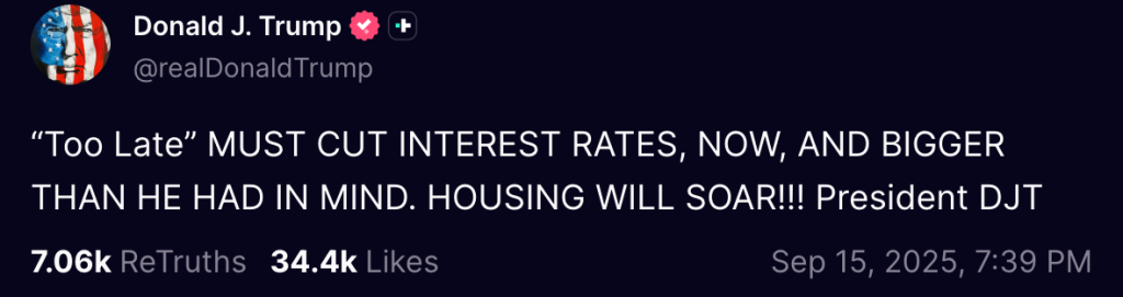ធនាគារកណ្តាលអាមេរិកត្រូវបានគេរំពឹងថានឹងកាត់បន្ថយអត្រាការប្រាក់ចំនួន 25 bps ឬ 0.25% ជាលើកដំបូងចាប់តាំងពីខែធ្នូ ឆ្នាំ 2024 ដោយសារតែក្តីបារម្ភទាក់ទងនឹងបញ្ហាទីផ្សារការងារនាពេលបច្ចុប្បន្ន។ ទោះជាយ៉ាងណាក៏ដោយ លោកប្រធានាធិបតី Donald Trump ក៏បានបង្ហោះនៅលើប្រព័ន្ធផ្សព្វផ្សាយសង្គមរបស់គាត់ដោយលើកឡើងថាគាត់ចង់ទម្លាក់អត្រាការប្រាក់ក្នុងកម្រិតធំជាងនេះ ពោលគឺសំដៅទៅលើការកាត់បន្ថយ 50bps ឬច្រើនជាងនេះ ដោយសារតែបញ្ហាទីផ្សារលំនៅឋាន និងការកើនឡើងបំណុលជាតិ។