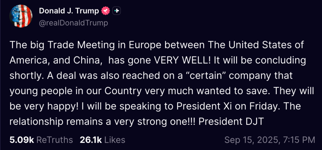 In fact, US Treasury Secretary Scott Bessent said a framework deal to keep the TikTok app running in the US has been reached, albeit the terms of the blueprint remain unclear. The next meeting between the US and China will be on Friday.