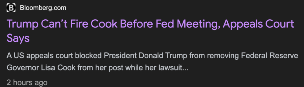 Meanwhile, regarding the FED’s Lisa Cook, who President Donald Trump has been trying to dismiss from the FED rate decision, is now being rejected from an appeals court in the US.