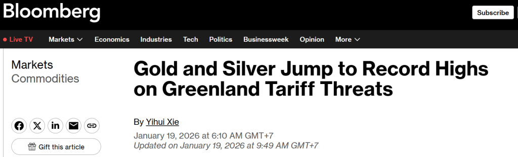 According to Bloomberg, Gold and silver jumped to record highs as President Donald Trump’s push to take over Greenland spurred fears of a damaging trade war between the US and Europe. Geopolitical tensions are acting as the primary catalyst behind the current surge in gold demand, as investors seek protection from rising political and trade-related uncertainty. Renewed disputes involving major economies, particularly around tariffs, strategic territories, and diplomatic confrontations, have increased fears of economic fragmentation and slower global growth.