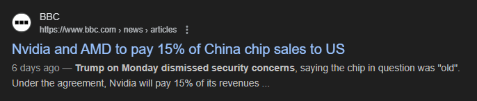 លោកប្រធានាធិបតី Trump បានបញ្ជាក់ថា Nvidia បានយល់ព្រមបង់ប្រាក់ឱ្យរដ្ឋាភិបាលសហរដ្ឋអាមេរិកចំនួន 15% នៃប្រាក់ចំណូលពីការលក់បន្ទះឈីប H20 AI របស់ខ្លួនទៅកាន់ប្រទេសចិន ដើម្បីទទួលបានអាជ្ញាប័ណ្ណនាំចេញ ហើយអនុញ្ញាតឱ្យបន្តការលក់ឡើងវិញបន្ទាប់ពីការរឹតបន្តឹងលើកមុន។ នេះក៏រាប់បញ្ចូលទាំង AMD ផងដែរ ដែលដំបូង លោក Trump ព្យាយាមទាមទាររក 20%។