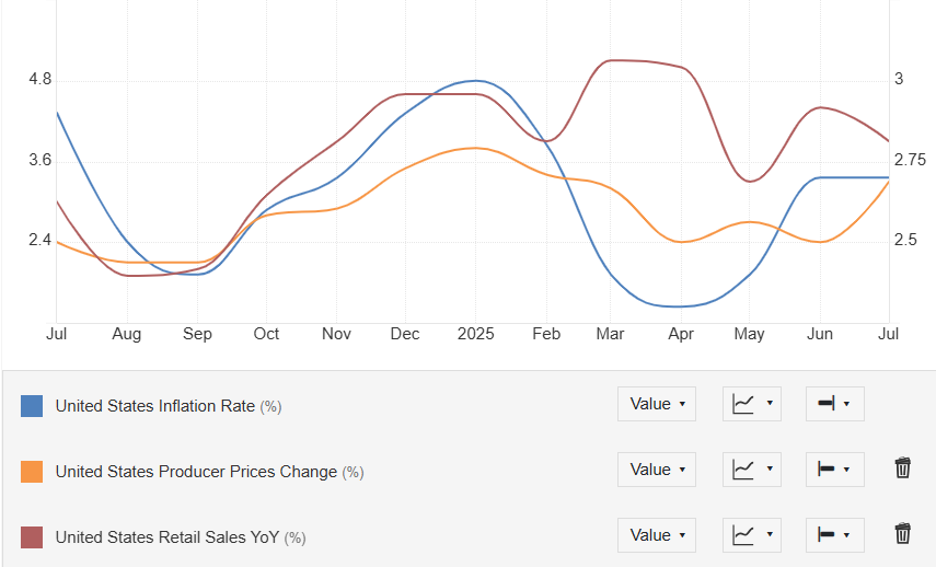 ទោះបីជាទិន្នន័យអតិផរណានៅអាមេរិកបច្ចុប្បន្នអាចនឹងពិបាកក្នុងការឈានទៅដល់កម្រិតគោលដៅចំនួន 2% ហើយទិន្នន័យតម្រូវការប្រើប្រាស់មានតិចជាងមុនក៏ដោយ ក៏ទីផ្សារនៅតែជឿជាក់ថា អត្រាការប្រាក់អាចនឹងកាត់បន្ថយខែកញ្ញានោះដែរ នេះបើយោងតាមឧបករណ៍ CME Fedwatch។ លោក Trump បានអះអាងថា ពន្ធមិនបានបង្កឱ្យមានអតិផរណា ឬបញ្ហាជាតិផ្សេងទៀតទេ។ លោកបានជំរុញឱ្យធនាគារកណ្តាលអាមេរិកបន្ទាបអត្រាការប្រាក់មកត្រឹម 1% ដោយលើកហេតុផលថា វានឹងជំរុញកំណើនសេដ្ឋកិច្ច។
