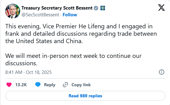 The US and China trade talks will proceed further in Malaysia this week between Treasury Secretary Scott Bessent and Vice Premier He Lifeng after their “frank and detailed” talk last week. Although Trump reiterated a positive talk with a Chinese official, if the talk continues to go well, then we are likely to see more setbacks in the gold price. And if not, more escalation, then the probability of more gold rising will be higher.